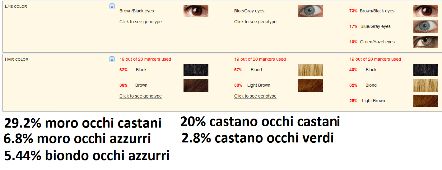 A destra i risultati di un ipotetico figlio tra i due il quale avrebbe il 73% di avere gli occhi castani,il 17% di averli azzurri e il 10% di averli verdi.