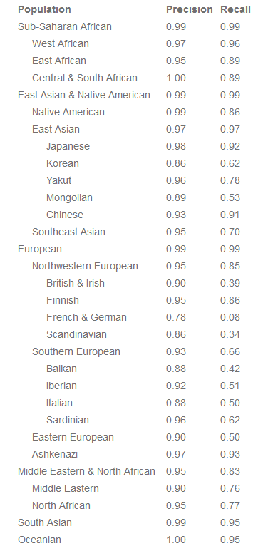 Come potete vedere nella tabella, basata su 23andme, sia precisione che recupero raggiungono su larga scala percentuali altissime, talvolta del 99-100%.