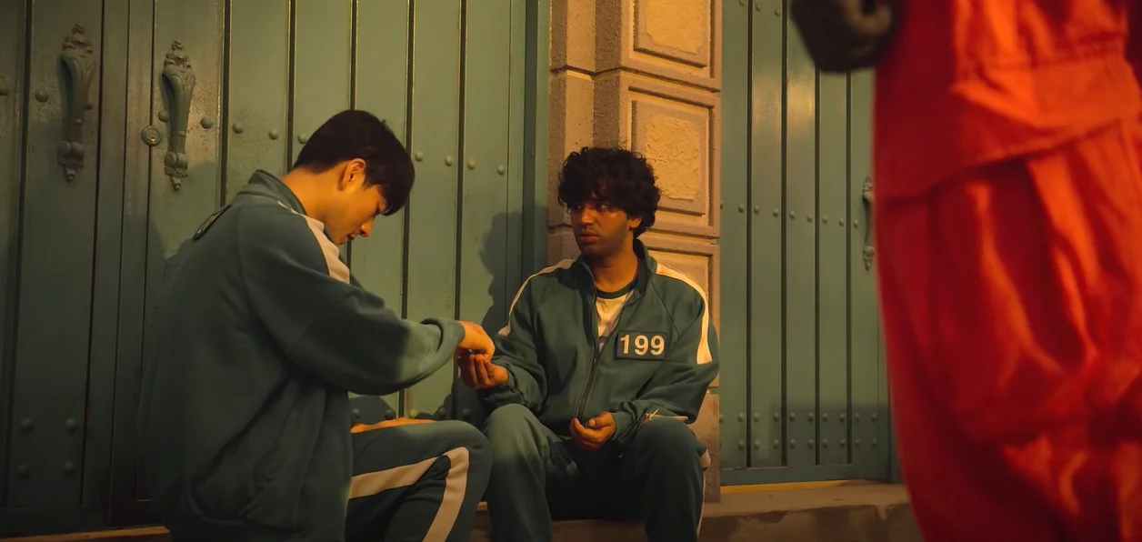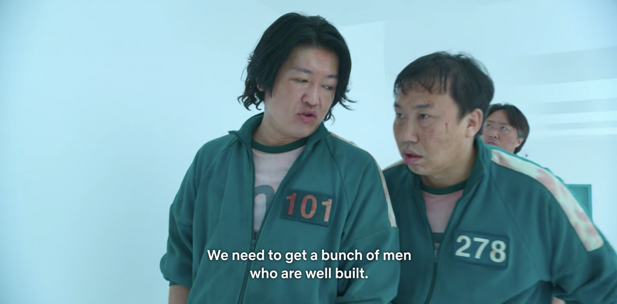 Allo stato di natura la forza fisica è una caratteristica molto preziosa per sopravvivere, ma se si parla di esseri umani non è quella che ti dà più potere sugli altri. Questo perché l’uomo è un animale sociale, tende ad organizzarsi e a collaborare. Un uomo molto forte può battere un uomo più debole, ma se più persone deboli si alleano possono facilmente mettere fuori gioco il più forte. Interessante sotto questo punto di vista la scena in cui il numero 101, contando sulla maggiore forza fisica, pianifica di attaccare le squadre rivali per uccidere i concorrenti approfittando del coprifuoco e va da 456 che sta costruendo delle barricate.